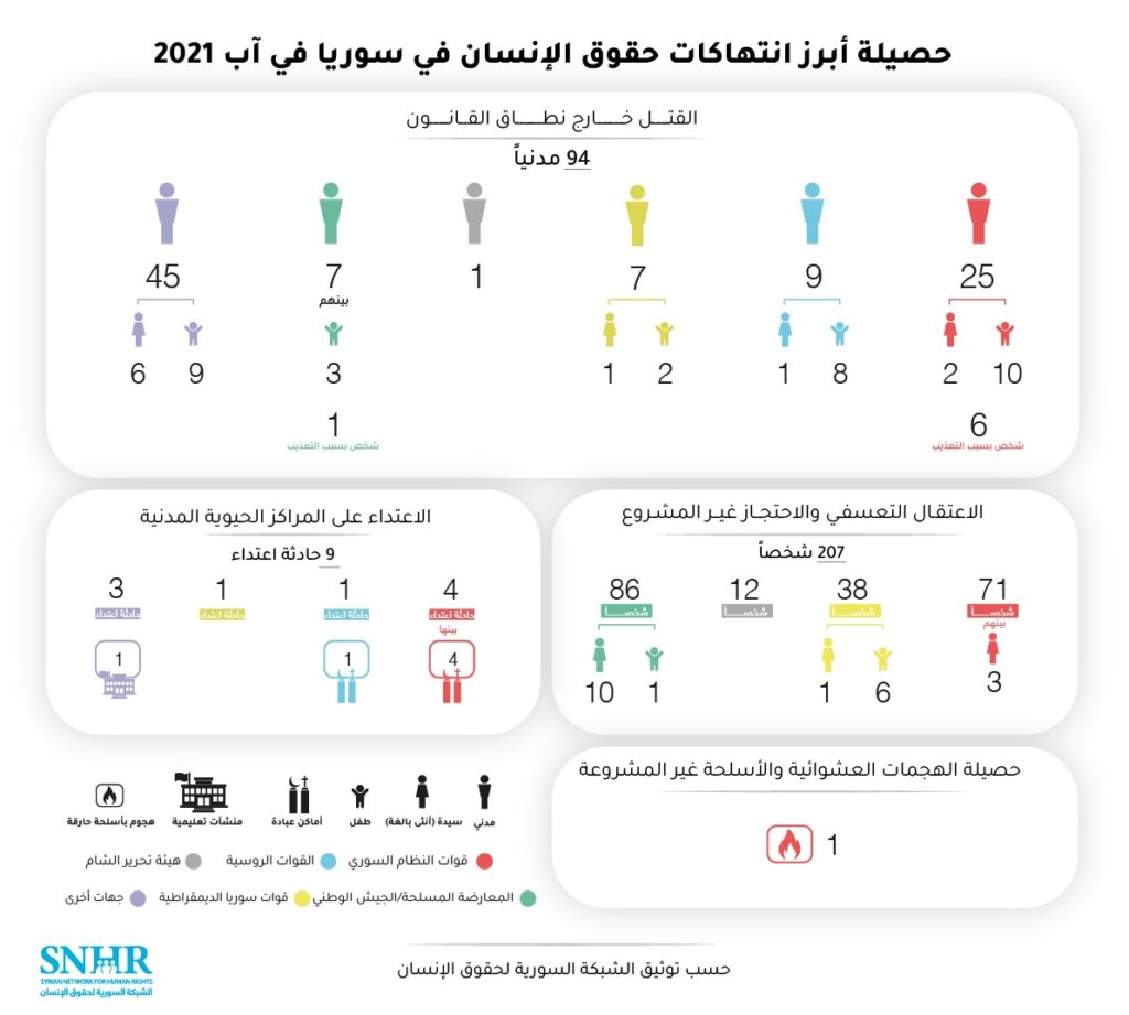 سجَّل التقرير في آب مقتل 94 مدنياً بينهم 32 طفلاً وعشر سيدات، وبذلك أصبحت حصيلة الضحايا المدنيين 946 مدنياً منذ مطلع عام 2021 حتى أيلول من العام ذاته.