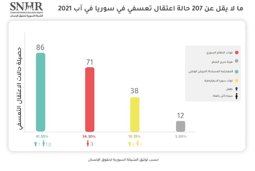 كما وثق التقرير ما لا يقل عن 207 حالات اعتقال تعسفي بينها سبعة أطفال و14 سيدة على يد أطراف النزاع والقوى المسيطرة في سوريا في شهر آب، تحوَّل 174 منهم إلى مختفين قسرياً.