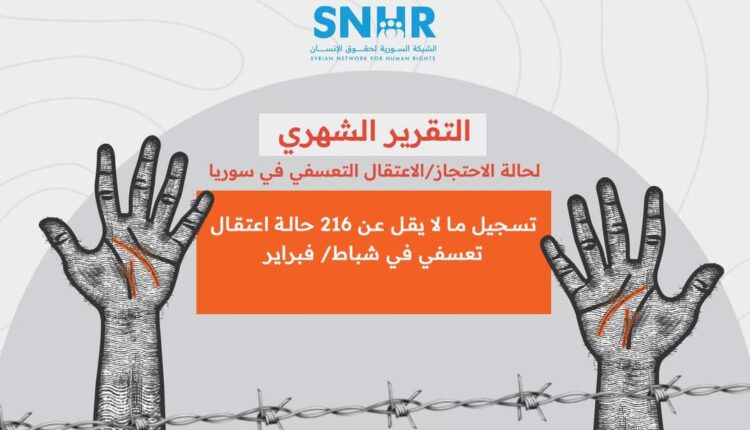التقرير الشهري الصادر عن الشبكة السورية لحقوق الإنسان لشهر شباط/فبراير 2025 يكشف عن 216 حالة احتجاز تعسفي، مما يسلط الضوء على تحديات المرحلة الانتقالية، ويؤكد الحاجة الملحّة إلى تبني سياسات صارمة تضمن الحريات الأساسية وتمنع تكرار أخطاء الماضي.