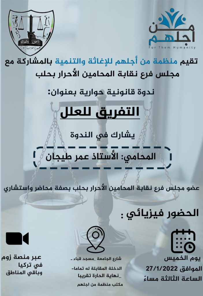 تقيم “منظمة من أجلهم للإغاثة والتنمية” ندوة حوارية بالاشتراك مع مجلس نقابة المحامين الأحرار- فرع حلب بعنوان “التفريق للعلل”.
