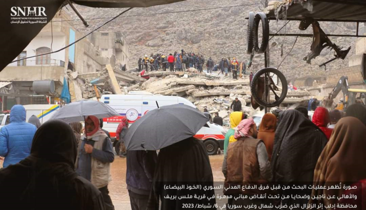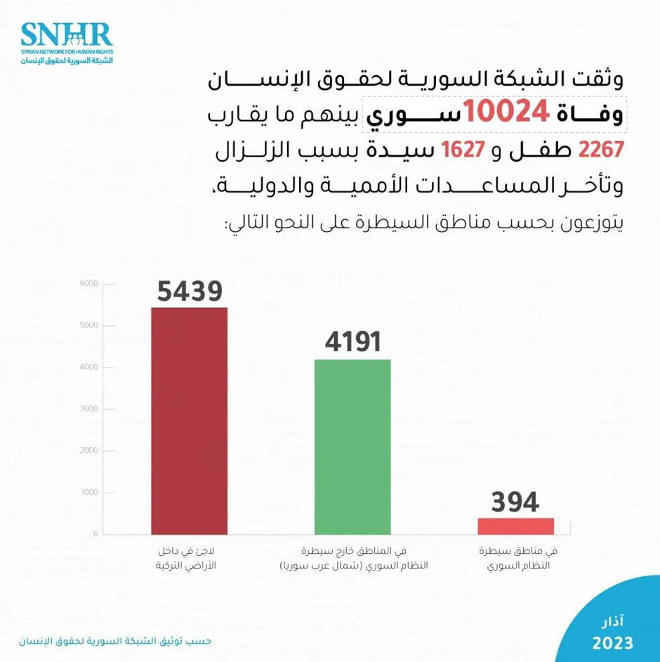 قالت “الشبكة السورية لحقوق الإنسان” في تقريرها الصادر يوم الثلاثاء 28 آذار 2023، “إنها سجلت وفاة 10024 سورياً بسبب الزلزال الذي ضرب شمال غرب سوريا وجنوب تركيا فجر الإثنين 6 شباط 2023، بينهم 4191 توفوا في المناطق خارج سيطرة النظام السوري، و394 في المناطق الخاضعة لسيطرته، و5439 لاجئاً في تركيا.