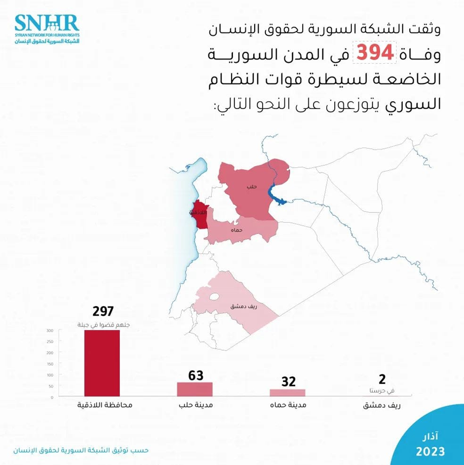 سجل التقرير وفاة394 شخصاً في المدن السورية الخاضعة لسيطرة قوات النظام السوري، حيث تم تسجيل وفاة 297ضحية في محافظة اللاذقية جلهم قضوا في جبلة، و63 ضحية في مدينة حلب، و32 ضحية في حماه، وضحيتين في حرستا بريف دمشق.