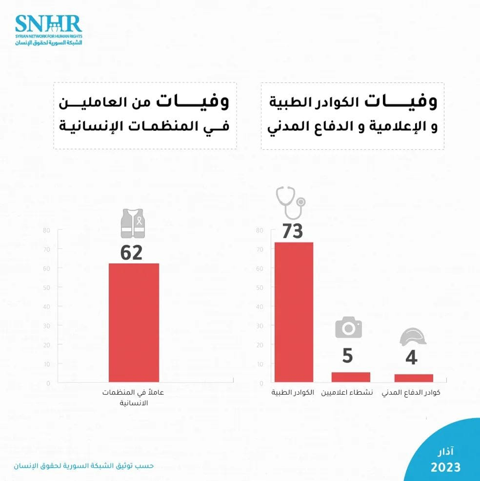 ووفقاً للتقرير فإن من بين الضحايا الذين توفوا 73 ضحية من الكوادر الطبية، و5 من الكوادر الإعلامية، و62 عاملاً في المنظمات الإنسانية. كما سجل وفاة 4 من كوادر الدفاع المدني في شمال غرب سوريا.