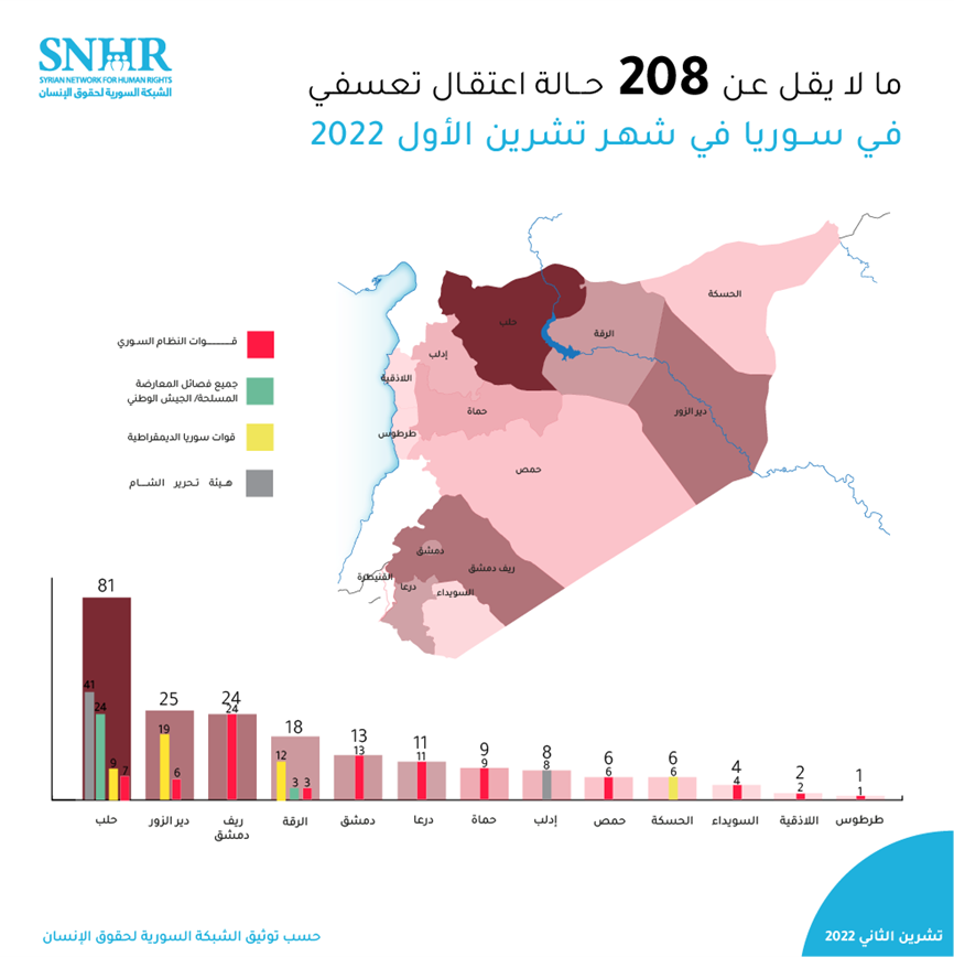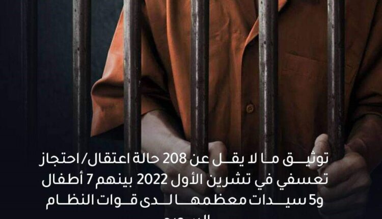 “الشبكة السورية” توثق 208 حالة اعتقال تعسفي في سوريا خلال تشرين الأول 2022