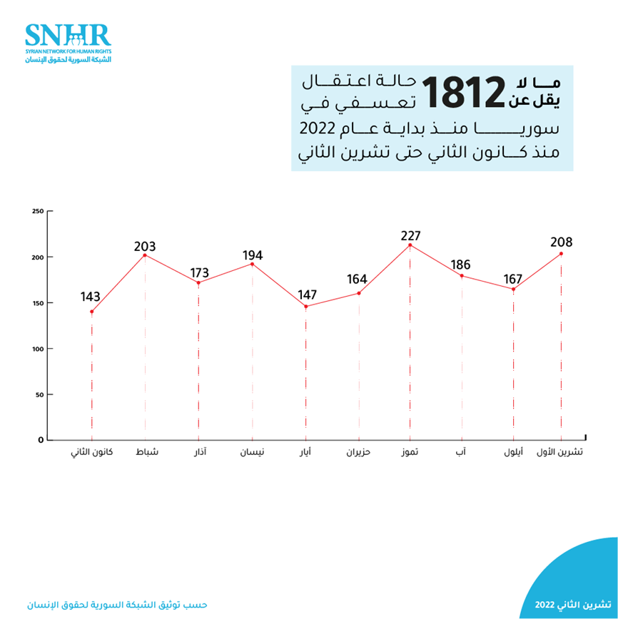 وثق التقرير ما لا يقل عن 1812 حالة اعتقال تعسفي منذ مطلع العام الحالي وحتى تشرين الثاني، بينهم 93 طفلاً و62 سيدة، وقد تحوَّل 1365 منهم إلى مختفين قسرياً.