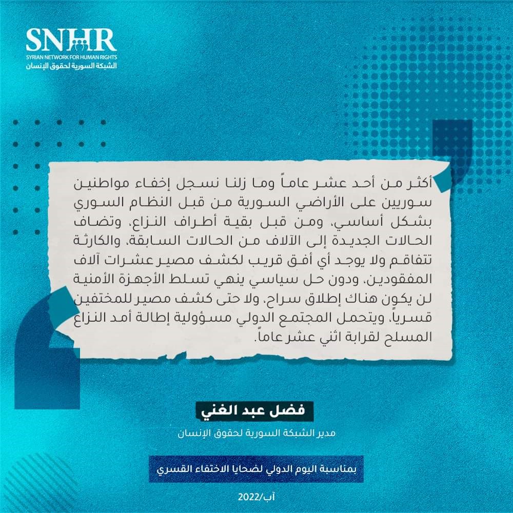 “أكثر من أحد عشر عاماً وما زلنا نسجل إخفاء مواطنين سوريين على الأراضي السورية من قبل النظام السوري بشكل أساسي، ومن قبل بقية أطراف النزاع، وتضاف الحالات الجديدة إلى الآلاف من الحالات السابقة، والكارثة تتفاقم ولا يوجد أي أفق قريب لكشف مصير عشرات آلاف المفقودين، ودون حل سياسي ينهي تسلط الأجهزة الأمنية لن يكون هناك إطلاق سراح، ولا حتى كشف مصير للمختفين قسرياً، ويتحمل المجتمع الدولي مسؤولية إطالة أمد النزاع المسلح لقرابة اثني عشر عاماً”.