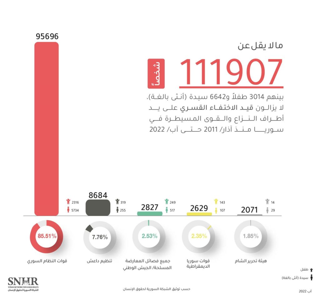 بمناسبة اليوم الدولي لضحايا الاختفاء القسري 30 آب من كل عام، أصدرت الشبكة السورية لحقوق الإنسان يوم الثلاثاء 30 آب 2022، تقريرها السنوي الحادي عشر عن الاختفاء القسري في سوريا، وقالت فيه إنَّ قرابة 111 ألف مواطن مختفٍ قسرياً منذ آذار 2011 حتى آب 2022، غالبيتهم العظمى لدى النظام السوري مما يشكل جريمة ضد الإنسانية.