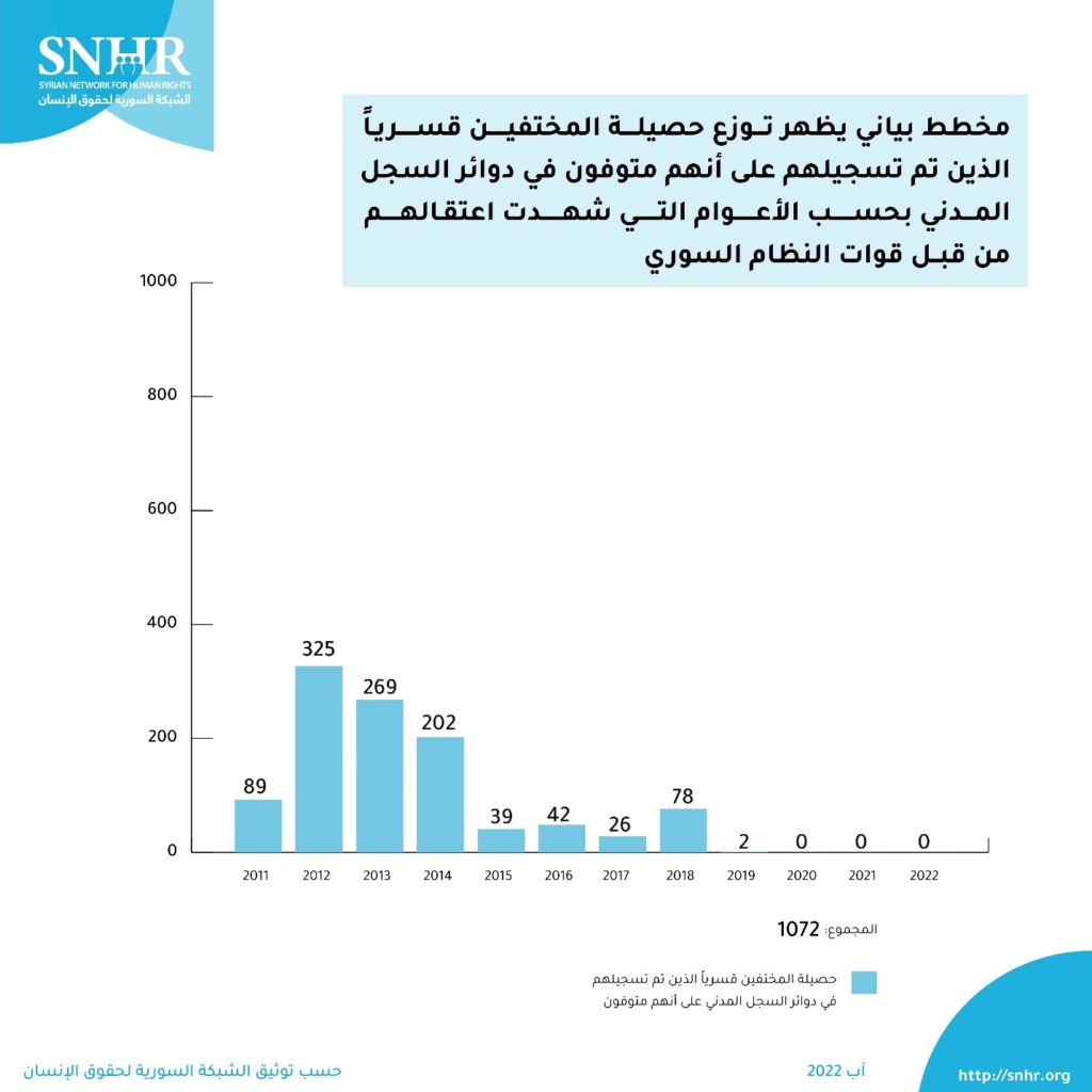 يظهر المخطط أنّ الحصيلة الأعلى من بين الـ 1072 حالة، كانت في عام 2012 ثم عام 2013 يليه عام 2014 وهي الأعوام الأبرز التي شهدت أكبر موجة اختفاء قسري في مراكز الاعتقال التابعة للنظام السوري.