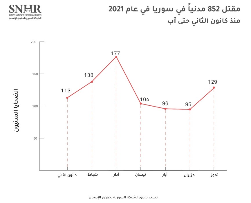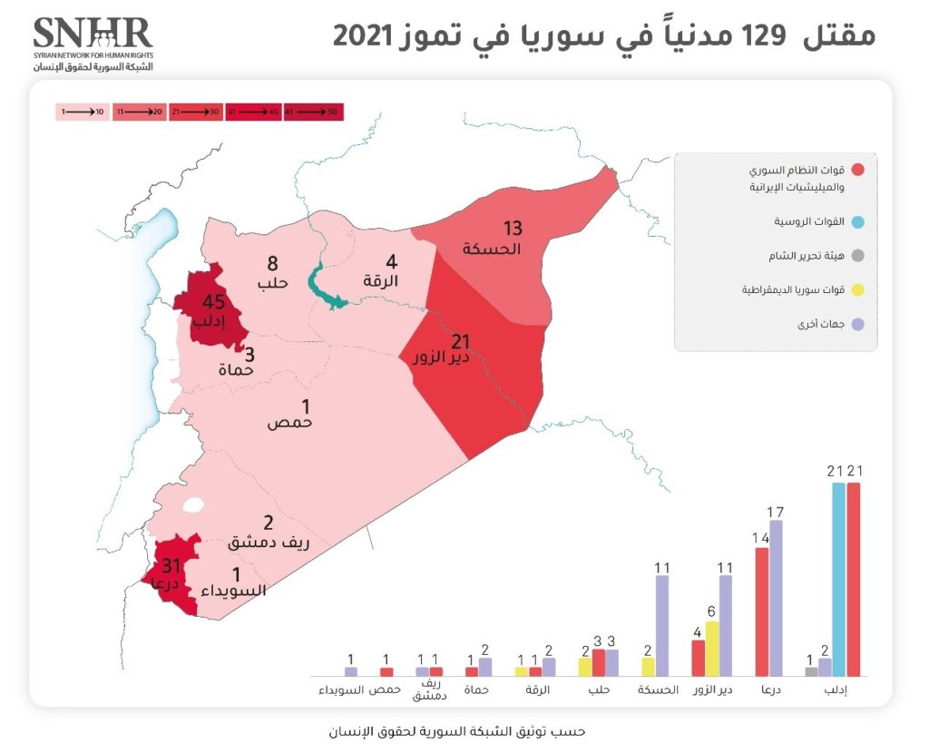 أصدرت الشبكة السورية لحقوق الإنسان يوم الأحد 1 آب 2021، تقريرها الشهري، وقالت فيه ” إنَّ القتل خارج نطاق القانون يحصد 129 مدنياً في سوريا في تموز 2021 بينهم 44 طفلاً و17 سيدة، وعشر ضحايا بسبب التعذيب، وبذلك أصبحت حصيلة الضحايا المدنيين 852 مدنياً، منذ مطلع عام 2021 حتى آب من العام ذاته، مشيرة إلى أن محافظتي إدلب ودرعا قد تصدرتا بقية المحافظات من حيث حصيلة الضحايا المدنيين الذين قتلوا على يد النظام السوري وحلفائه.