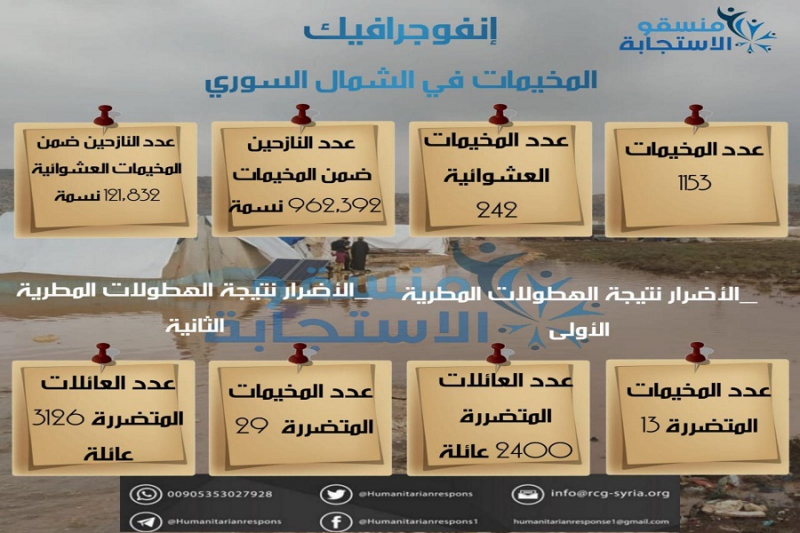 وأشارت إلى أن أعداد المخيمات في مناطق شمال غرب سوريا وصلت إلى 1,489 مخيم يقطنها 1,512,764 نسمة من بينها 452 مخيم عشوائي يقطنها 233,671 نسمة.