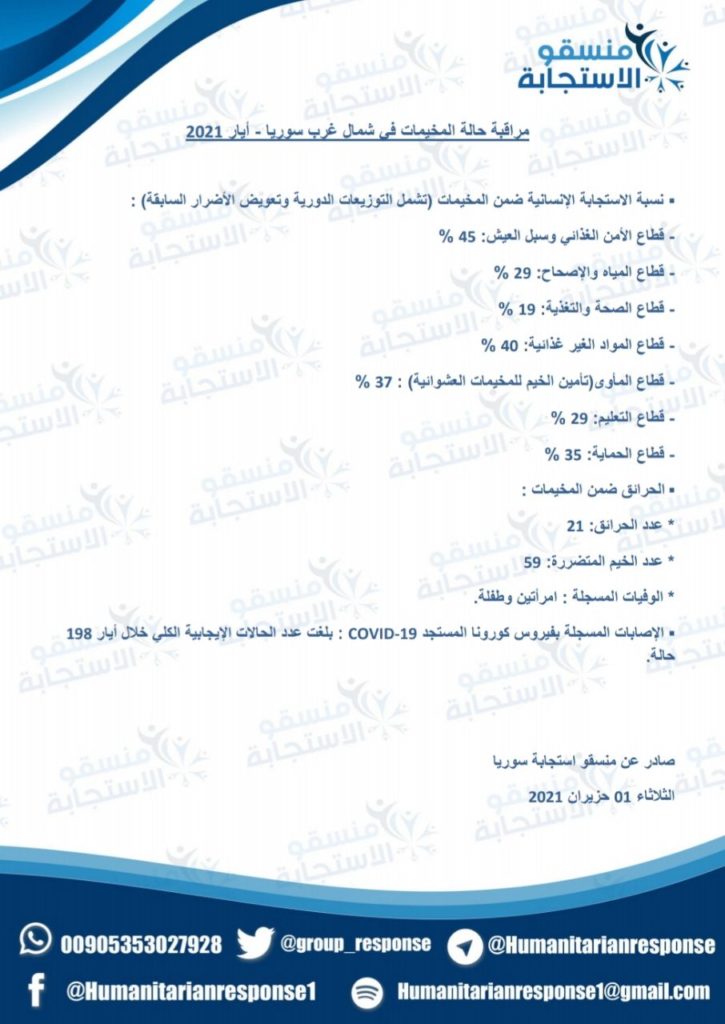 أما الحرائق ضمن المخيمات، فبلغ عدد الحرائق: 116، وعدد الخيم المتضررة: 276، أما الضحايا والإصابات: 8 وفيات (6 أطفال، 2 نساء)، 14 إصابة (6 رجال، 5 أطفال، 3 نساء)، وبلغت الإصابات المسجلة بفيروس كورونا المستجد: 1,050