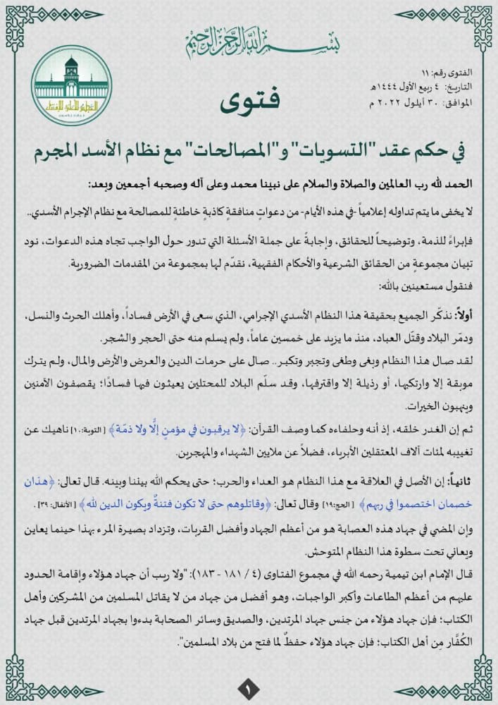 تلقت صحيفة نينار برس نسخة من فتوى أصدرها المجلس الأعلى للإفتاء في الداخل السوري بتحريم الصلح مع النظام الأسدي، وتضعها أمام جمهورنا للاطلاع عليها