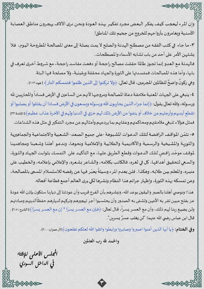 المجلس الأعلى للإفتاء في الداخل السوري يفتي بتحريم الصلح مع النظام الأسدي