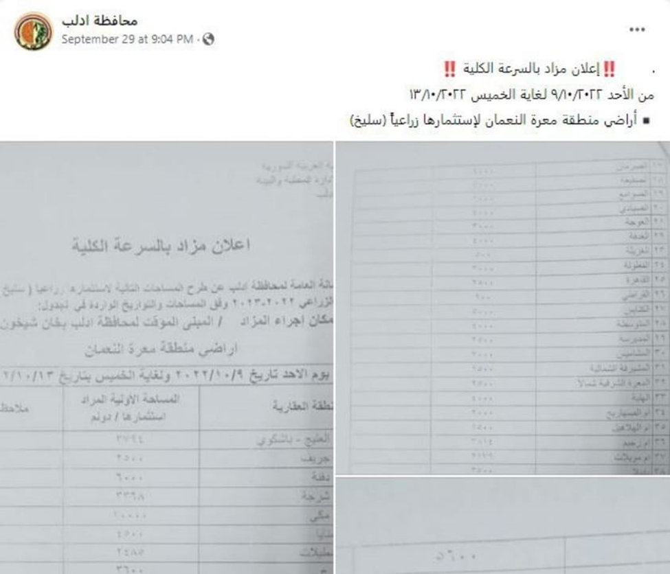 ورصد التقرير إعلان النظام السوري عبر الأمانة العامة لمحافظة إدلب، في 29 أيلول 2022، عن ثلاثة مزادات علنية شملت أراضٍ زراعية في ريف محافظة إدلب، وهذا يعني استمرار النظام السوري في نهب المزيد من أراضي النازحين واللاجئين، ومحاولة التغطية عليها عبر تكتيك “المزادات العلنية”.