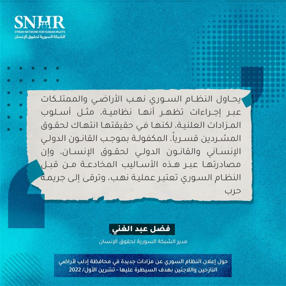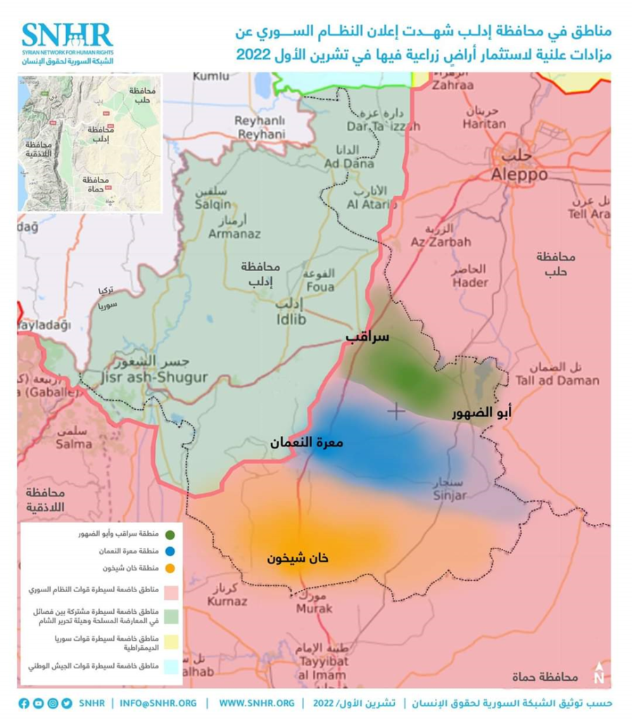 أصدرت “الشبكة السورية لحقوق الإنسان” يوم الخميس 20 تشرين الأول 2022، تقريراً تحدثت فيه عن إعلان النظام السوري عن “مزادات علنية” جديدة لأراضي النازحين واللاجئين في محافظة إدلب بهدف “السيطرة عليها”.