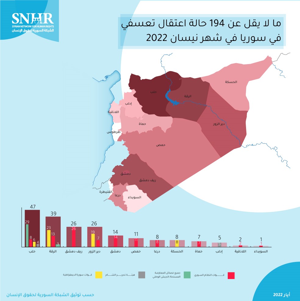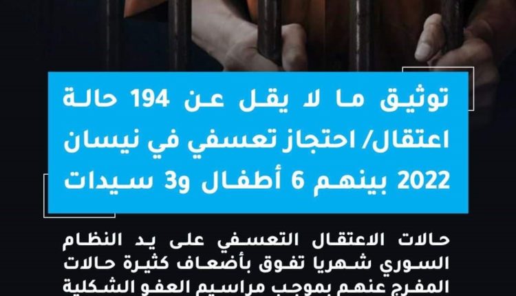 سجَّل التقرير في نيسان ما لا يقل عن 194حالة اعتقال تعسفي بينها ستة أطفال وثلاث سيدات، وقد تحول 159 منهم إلى مختفين قسرياً.