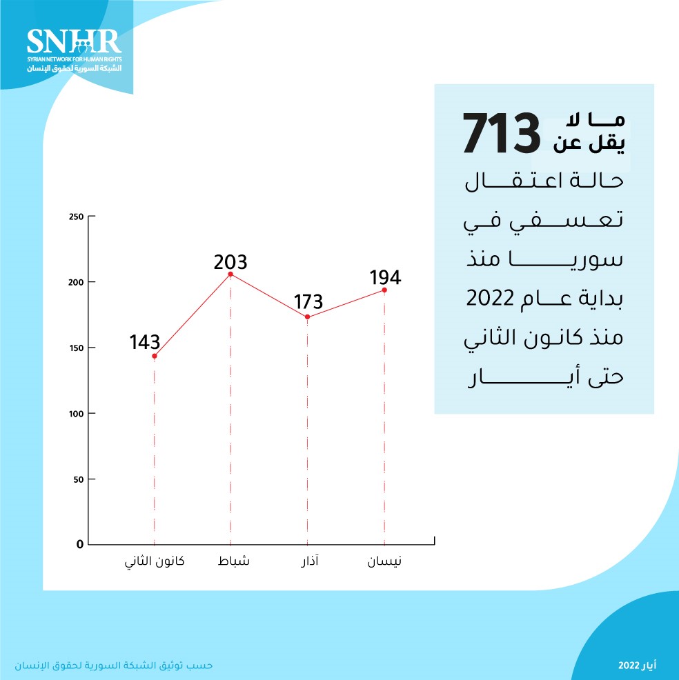 وثق تقرير الشبكة السورية لحقوق الإنسان مالا يقل عن 713 حالة اعتقال تعسفي منذ بداية عام 2022 حتى أيار من العام الحالي، بينهم 25 طفلاً و19 سيدة، وقد تحول 533 منهم إلى مختفين قسرياً.