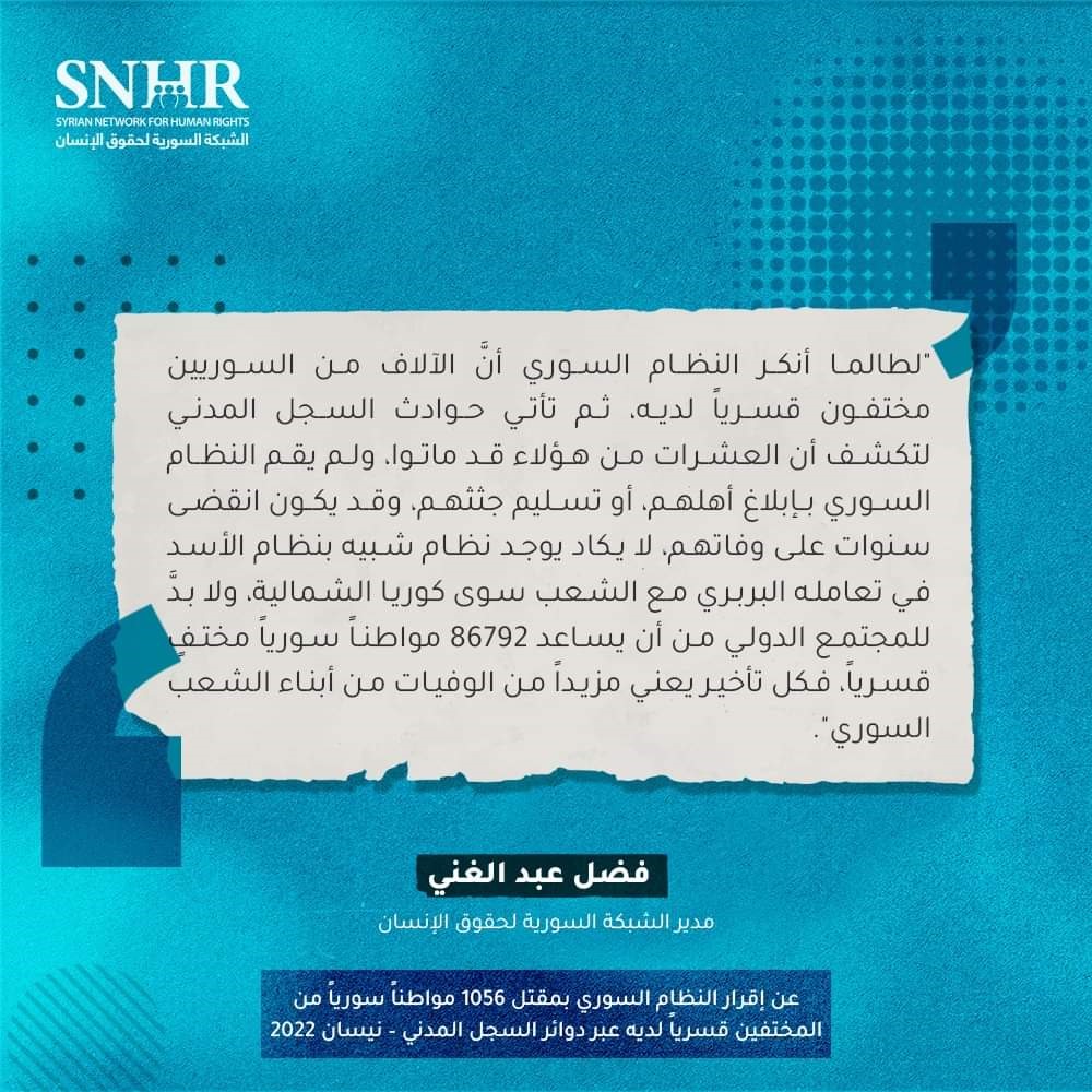 “لطالما أنكر النظام السوري أنَّ الآلاف من السوريين مختفون قسرياً لديه، ثم تأتي حوادث السجل المدني لتكشف أن العشرات من هؤلاء قد ماتوا، ولم يقم النظام السوري بإبلاغ أهلهم، أو تسليم جثثهم، وقد يكون انقضى سنوات على وفاتهم، لا يكاد يوجد نظام شبيه بنظام الأسد في تعامله البربري مع الشعب سوى كوريا الشمالية، ولا بدَّ للمجتمع الدولي من أن يساعد 86792 مواطناً سورياً مختفٍ قسرياً، فكل تأخير يعني مزيداً من الوفيات من أبناء الشعب السوري”.