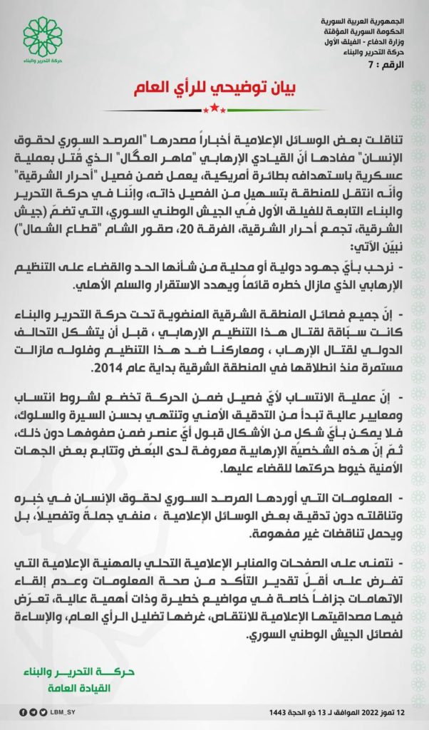 حركة التحرير والبناء التي تنضوي تحت جناحها “فرقة أحرار الشرقية”، أصدرت بياناً رفضت فيه ما جاء في بيان “المرصد السوري لحقوق الانسان” الذي يتخذ من بريطانيا مقراً له، الذي يقوده رجل باسم وهمي (رامي عبد الرحمن)، والذي يحمل اسما حقيقياً هو (أسامة سليمان)، ويتبع للمخابرات السورية، التي تزوده بمعلومات الغاية منها تضليل الرأي العام الدولي، في وقت كانت قوى الثورة وفصائلها تفتقد لمرصد يستقي أخباره من مصادر موثوقة، وكذلك لجهاز إعلامي متطور، يستطيع مواجهة التضليل الإعلامي للنظام الأسدي.