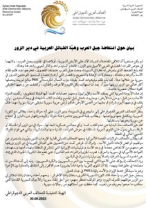 ينظر التحالف العربي الديموقراطي إلى ما يجري في السويداء ودير الزور على أنه حراك واحد، يتلاقى مع الثورة السورية ويتكامل معها ويواصلها، ويطالب بقية السوريين بمناصرة هذا الحراك وتأييده وإظهار دوره البارز في الدفاع عن سورية وهويتها ومستقبلها.