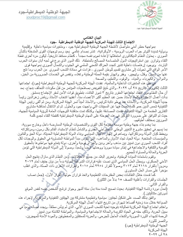 بيان ختامي حول الاجتماع الثالث للهيئة المركزية، للجبهة الوطنية الديمقراطية – جود