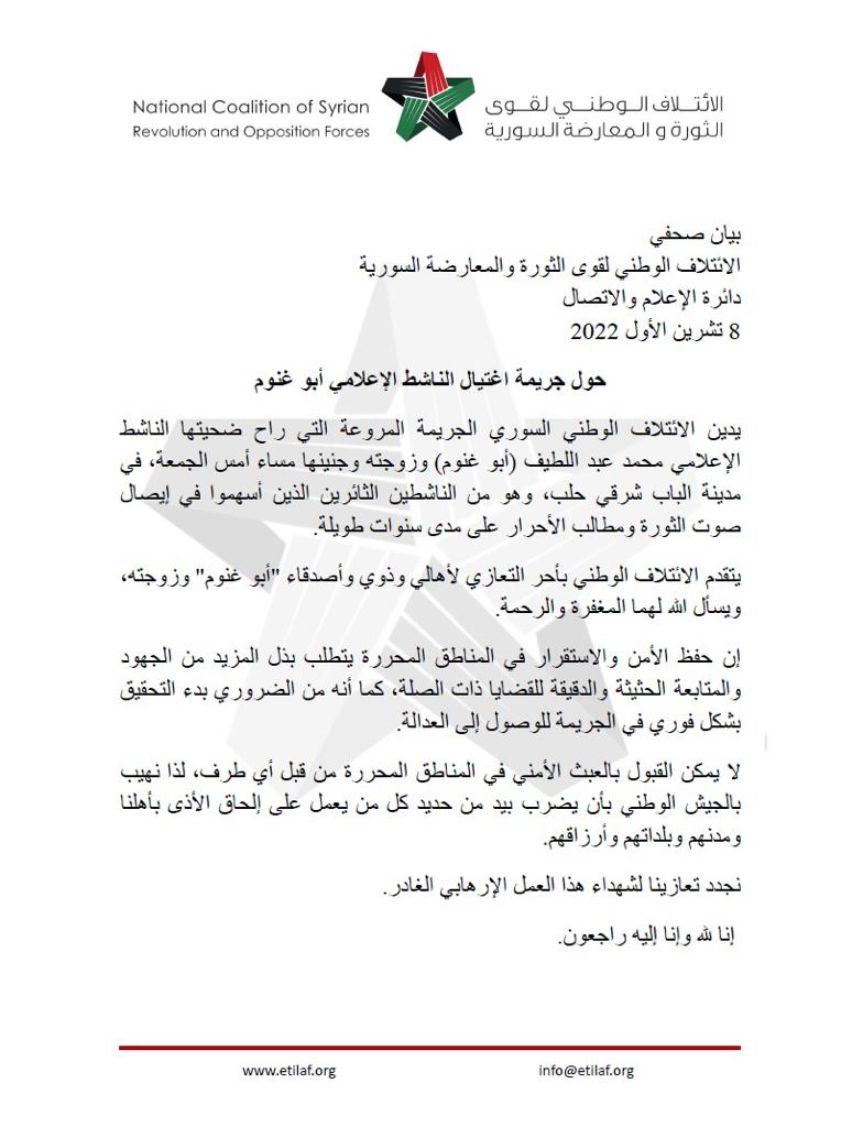 أصدر الائتلاف الوطني لقوى الثورة والمعارضة بياناً يدين فيه جريمة اغتيال الإعلامي أبو غنوم في مدينة الباب..