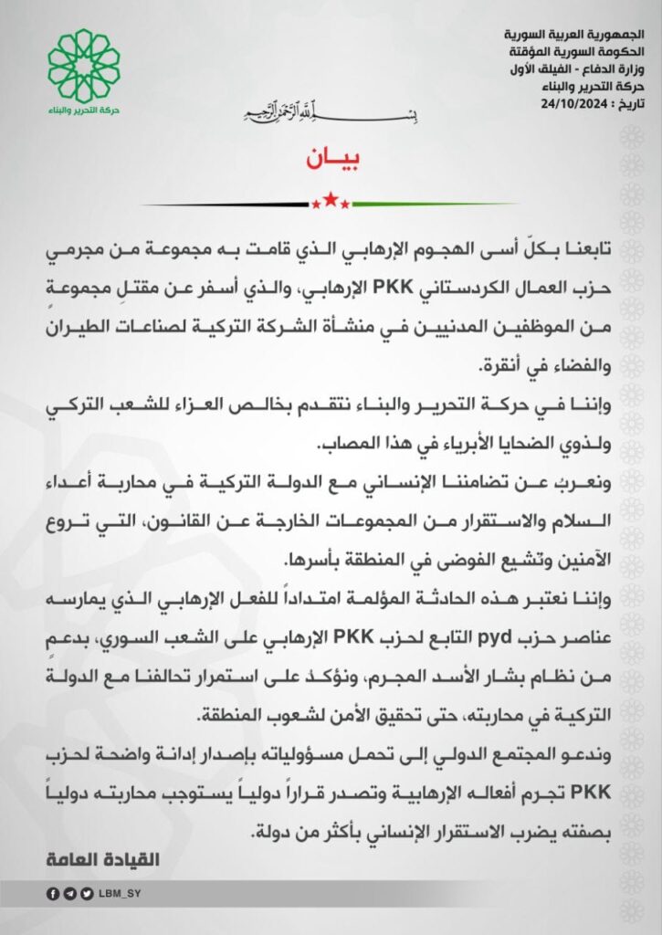 أصدرت حركة التحرير والبناء التي تنضوي ضمن مرتبات الفيلق الأول في الجيش الوطني السوري بياناً عزّت فيه بضحايا الهجوم الإرهابي بأنقرة. وتنشر نينار برس نصّ البيان:
