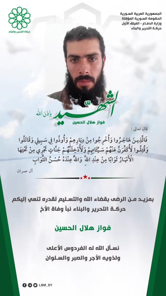 نعت حركة التحرير والبناء المنضوية ضمن مرتبات الفيلق الأول أحد مقاتليها في بيان نشرته على معرفاتها، وقد جاء في البيان: بمزيد من الرضى بقضاء الله والتسليم لقدره تنعي إليكم حركة التحرير والبناء نبأ وفاة الأخ فواز هلال الحسين.