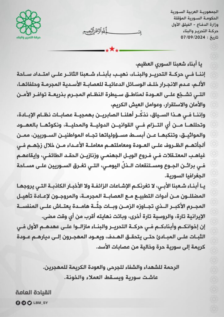 أصدرت حركة التحرير والبناء التي تنضوي ضمن مرتبات الفيلق الأول في الجيش الوطني السوري التابع لوزارة دفاع الحكومة المؤقتة بياناً حذّرت فيه السوريين من الانجرار وراء الوسائل الدعائية للنظام الأسدي التي تنشر أخباراً مضللة حول الأمن والأمان والاستقرار في مناطقه، مبينةً أنها دعايات كاذبة