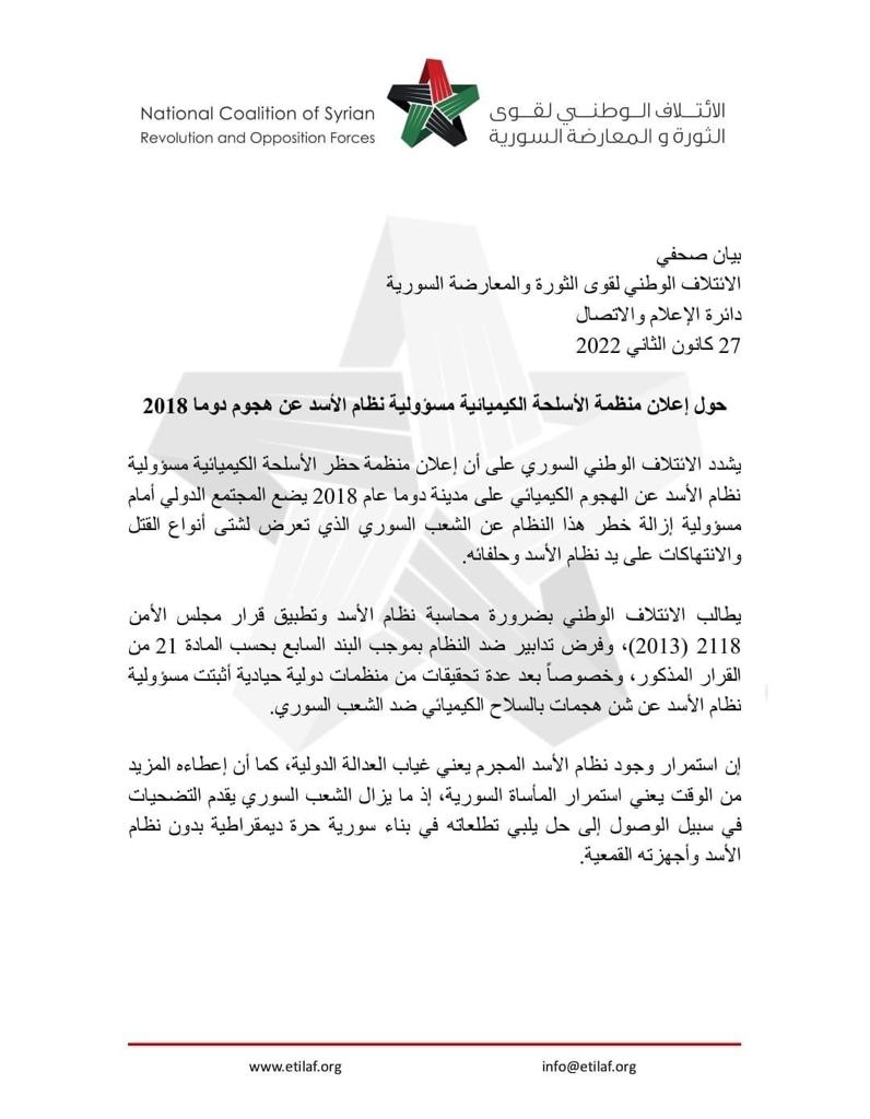 يشدد الائتلاف الوطني السوري على أن إعلان منظمة حظر الأسلحة الكيميائية مسؤولية نظام الأسد عن الهجوم الكيميائي على مدينة دوما عام 2018 يضع المجتمع الدولي أمام مسؤولية إزالة خطر هذا النظام عن الشعب السوري الذي تعرض لشتى أنواع القتل والانتهاكات على يد نظام الأسد وحلفائه.