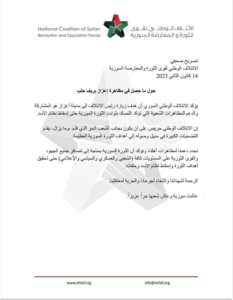 صدر عن ائتلاف قوى الثورة والمعارضة تصريح يتعلق بما جرى في إعزاز. نينار برس تنشر التصريح كما وردها
