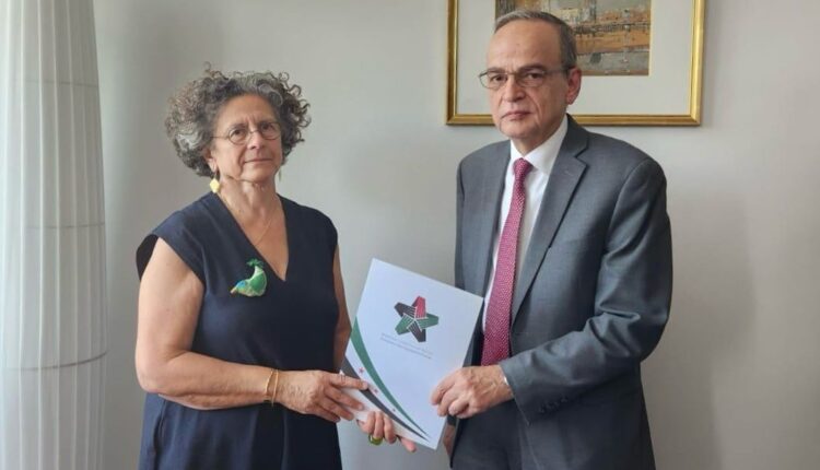رئيس الائتلاف الوطني السوري هادي البحرة يسلم المبعوثة الفرنسية الخاصة إلى سورية، السفيرة بريجيت كورمي خطاباً رسمياً موجه إلى وزيرة الخارجية
