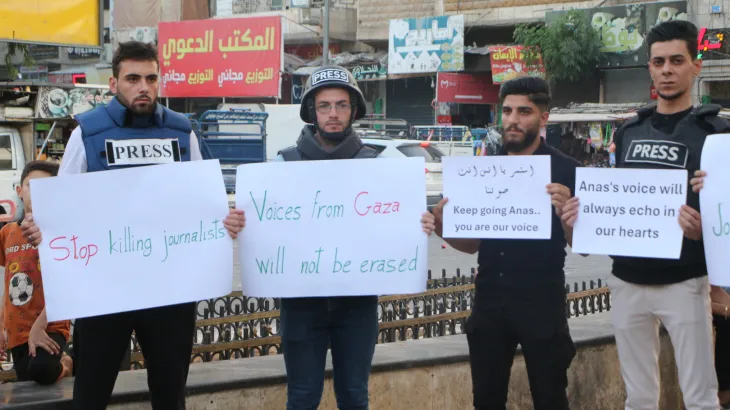 وانضم صحفيون سوريون إلى وقفات صامتة، مساء الاثنين، في مدن إدلب وطرطوس ودمشق وحمص حلب تضامنا مع صحفيي غزة، واستنكارا لاغتيال طاقم قناة الجزيرة وعلى رأسه المراسلان أنس الشريف ومحمد قريقع.