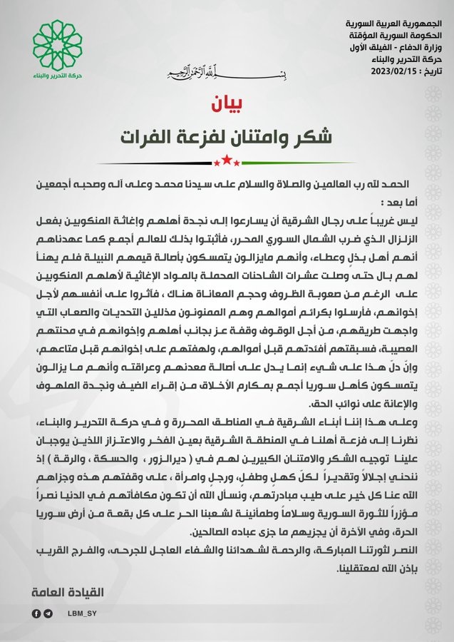 حركة التحرير والبناء هي من صلب أهل المنطقة الشرقية وهي استقبلت ويسّرت فزعة أهلها من أجل مساعدة المتضررين من الزلزال في الشمال السوري. نينار برس تنشر بيان حركة التحرير والبناء بهذا الصدد.
