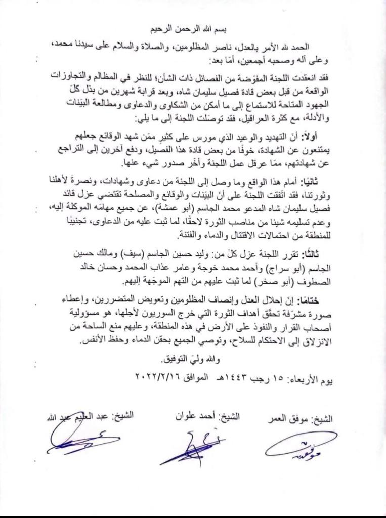 وصلت مكتب نينار برس صورة عن قرار إزاحة المدعو “أبو عمشة” عن قيادة فصيل سليمان شاه ومن أي دور قادم سياسياً وعسكرياً، ويأتي هذا القرار بعد تعطيل الأخير لمجريات تحقيق يدينه بانتهاكات كثيرة.