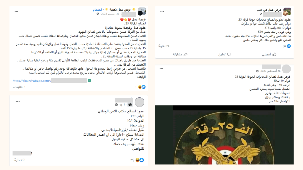 اتصل مراسل “سوريا على طول” بـ”المعلم” علي، وهو ضابط في المخابرات الجوية، وأكد الأخير وجود “عقود عمل في حلب وريف إدلب براتب شهري 250 ألف ليرة (28 دولاراً أميركياً، بحسب سعر صرف الليرة في السوق الموازية والبالغ 8850 ليرة للدولار الواحد)، لصالح المخابرات الجوية أو الإيرانيين”، إضافة إلى “إمكانية الحصول على دخل إضافي يومي يتراوح بين 15 و25 ألف ليرة (1.6 و 2.8 دولاراً) يومياً لقاء العمل في تجميع الحديد أو الحطب”، وقدم الضابط العديد من الإغراءات المتعلقة بطبيعة الدوام والإجازات وأيضاً بطاقة الحماية على الحواجز واصطحاب السلاح في الإجازات.