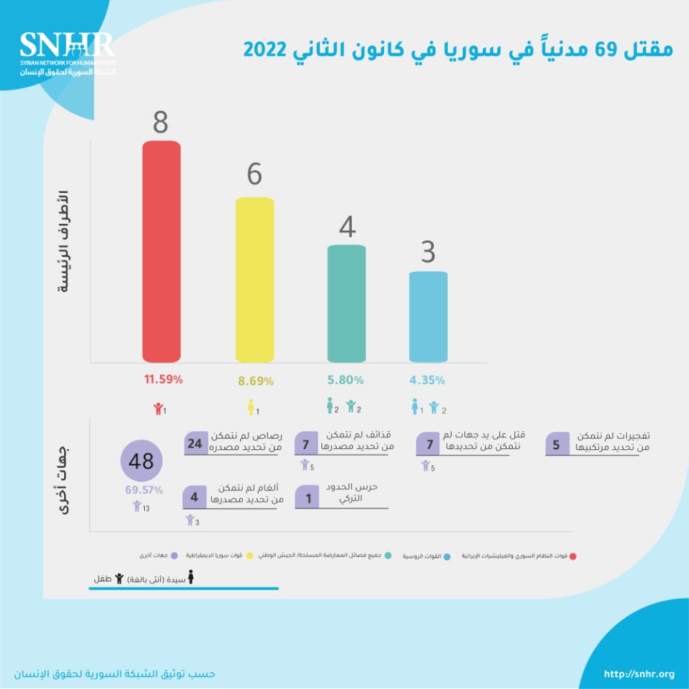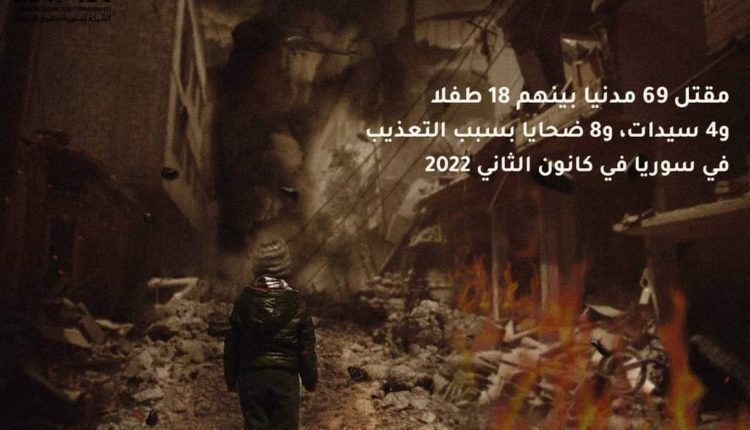 وجاء في التقرير، أنَّ 69 مدنياً قد قتلوا في سورية في كانون الثاني 2022 بينهم 18 طفلاً وأربع سيدات، وثمانية ضحايا بسبب التعذيب، مشيرة إلى أنها تعتبر بداية عام دموية لا تختلف عن الأعوام السابقة.