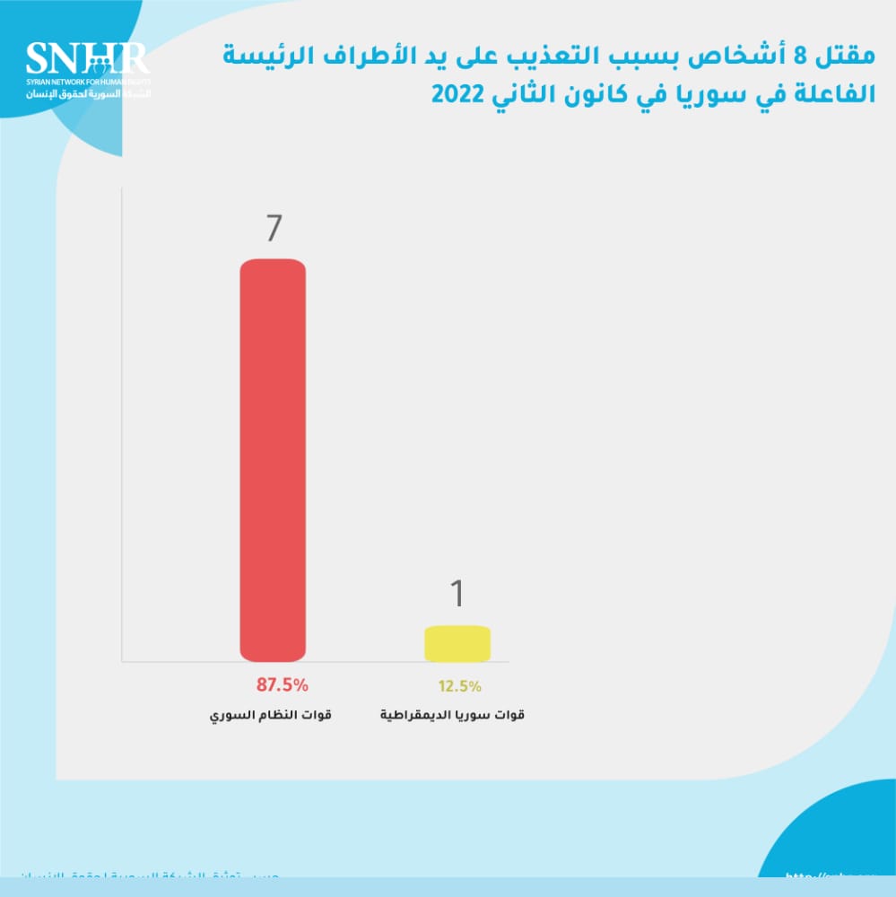 وثَّق التقرير في كانون الثاني 2022 مقتل ثمانية أشخاص بسبب التعذيب، سبعة منهم على يد قوات النظام السوري، وشخص واحد على يد قوات سورية الديمقراطية.