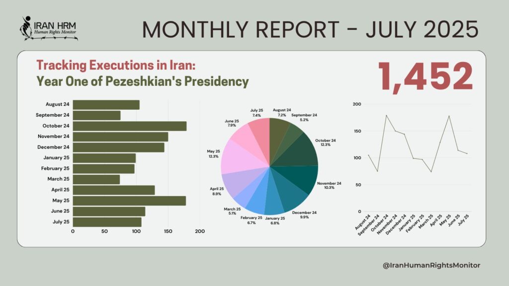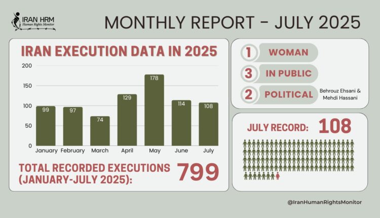 وفقاً للتقرير، شهد شهر يوليو تنفيذ 108 عمليات إعدام، من بينها 3 حالات إعدام علني في مدن بوكان ومياندوآب ودامغان. وبلغ هذا القمع ذروته فجر يوم الأحد، 27 يوليو، مع إعدام السجينين السياسيين بهروز إحساني ومهدي حسني، وهما من أنصار منظمة مجاهدي خلق الإيرانية . وأشار التقرير إلى أن الرجلين تعرضا لتعذيب جسدي ونفسي شديد في عنبر 209 سيئ السمعة بسجن إيفين، وحُكم عليهما بالإعدام في محاكمات صورية بتهم مثل “محاربة الله”. وبعد تنفيذ الإعدام، رفضت السلطات تسليم جثمانيهما لعائلتيهما، ودفنتهما سراً في مكان مجهول، في ممارسة وصفتها المنظمة بأنها “طبقة إضافية من التعذيب النفسي”.