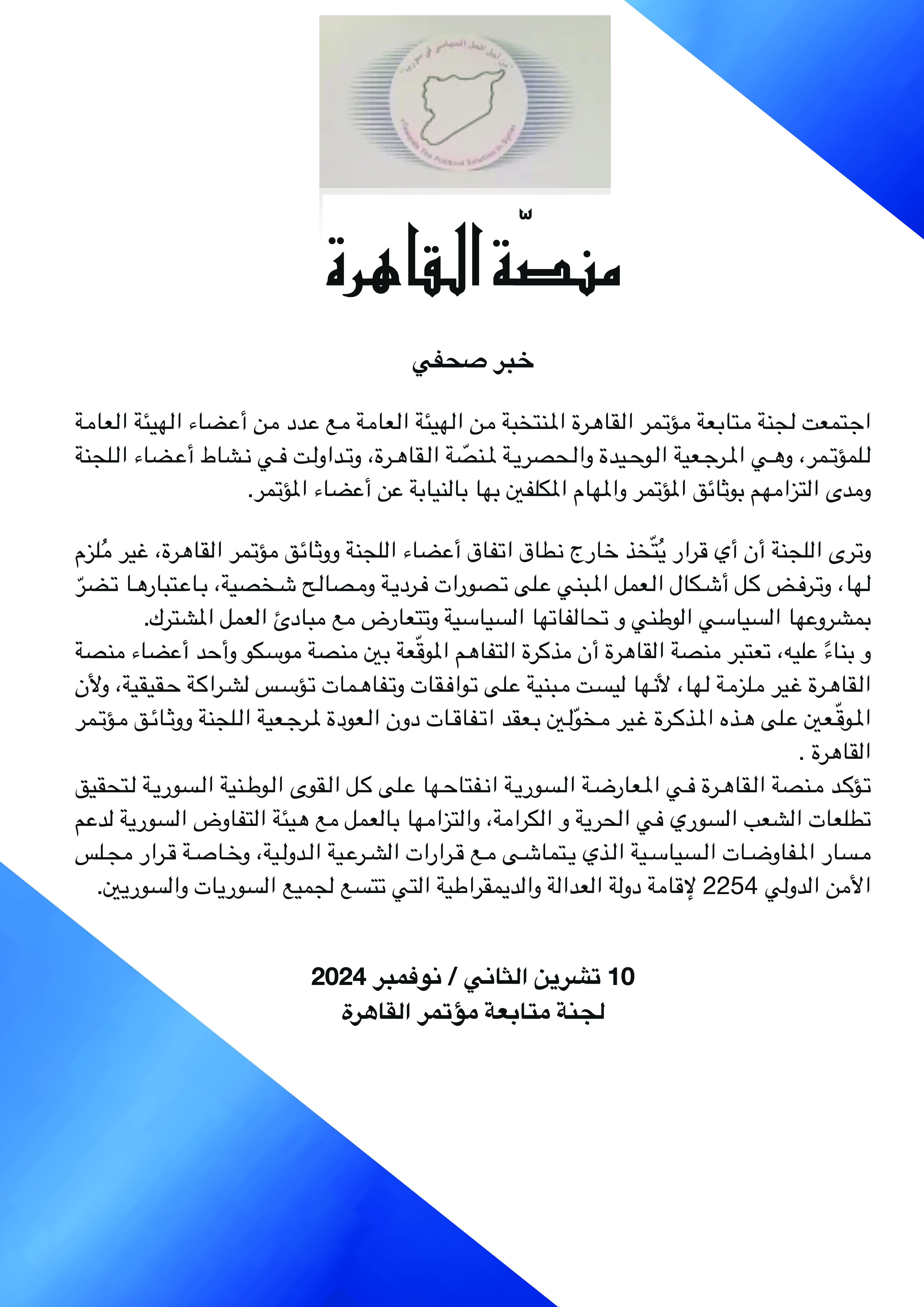 تنقل نينار برس نص الخبر الصحفي الذي نشرته لجنة متابعة مؤتمر القاهرة بتاريخ العاشر من تشرين الثاني 2024 وذلك لبيان حقيقة ما أثير حول “مذكرة التفاهم” مع منصة موسكو.