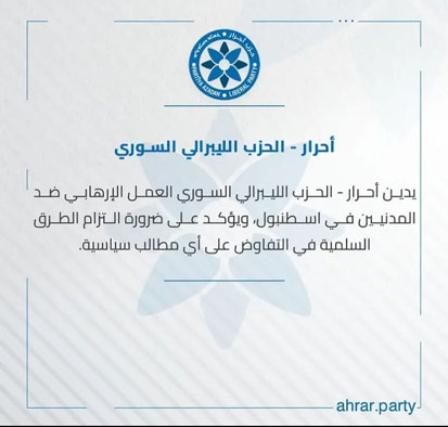 وجاء في بيان الحزب: “يُدين أحرار – الحزب الليبرالي السوري العمل الإرهابي ضد المدنيين في إسطنبول، ويؤكد على ضرورة التزام الطرق السلمية في التفاوض على أي مطالب سياسية”.