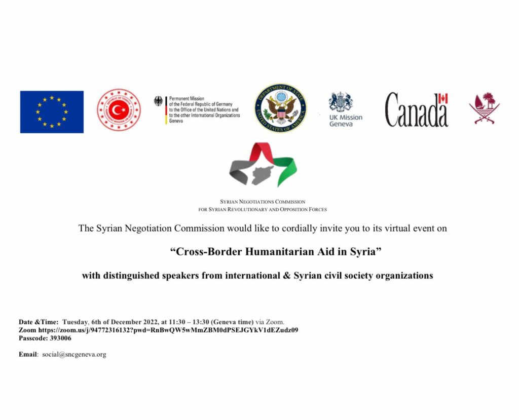 هذه الفعالية بدعوة من هيئة التفاوض ورعاية كل من الولايات المتحدة والاتحاد الأوروبي والبريطانيين والكنديين والألمان والقطرين والأتراك والفرنسين بمكتب الهيئة في جنيف وعلى منصة Zoom. غداً الساعة 11.30 بتوقيت جنيف، الساعة 13.30 بتوقيت تركيا.