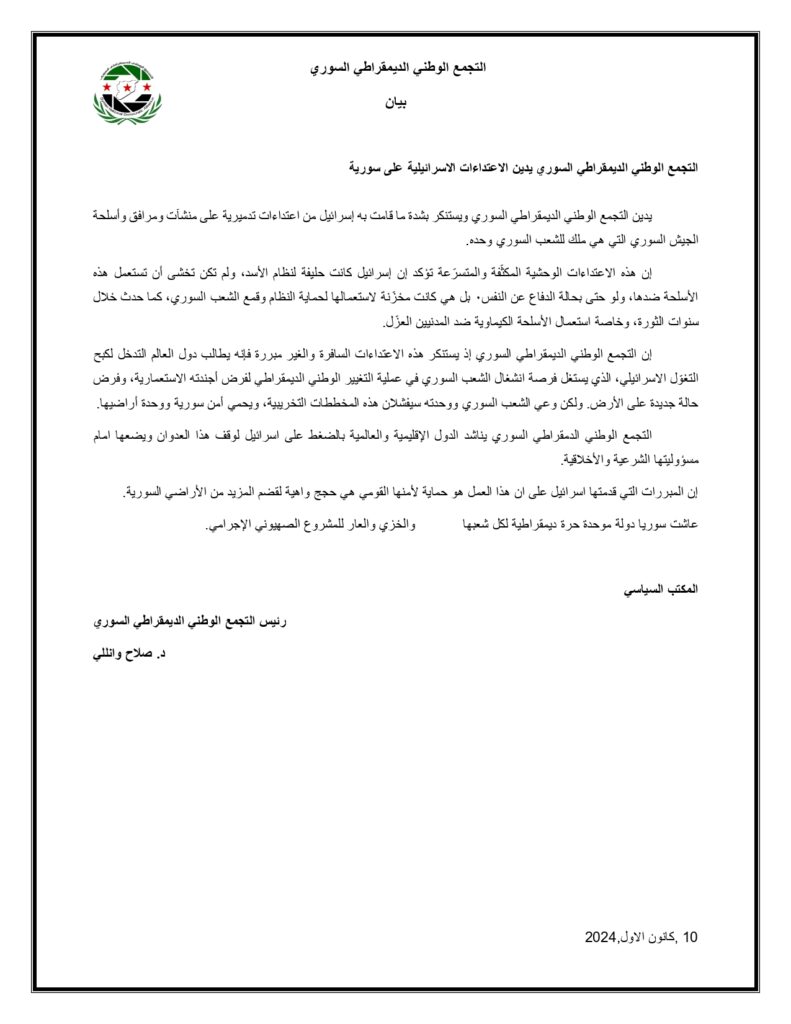 أصدر التجمّع الوطني الديمقراطي السوري بياناً أدان فيه الاعتداءات الإسرائيلية على سوريا، والتي شملت مواقع عسكرية هامة، هذه الاعتداءات غير المبررة جاءت بعد هروب رأس النظام البائد بشار الأسد.