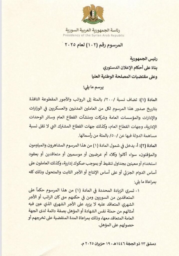 أصدر رئيس الجمهورية العربية السورية السيد أحمد الشرع المرسوم رقم 102 لعام 2025، القاضي بزيادة بنسبة 200% على الرواتب والأجور المقطوعة لكل من العاملين المدنيين والعسكريين في الوزارات والإدارات والمؤسسات العامة وشركات ومنشآت القطاع العام وسائر الوحدات الإدارية، وجهات القطاع العام وكذلك جهات القطاع المشترك التي لا تقل نسبة مساهمة الدولة فيها عن 50 بالمئة من رأسمالها.
