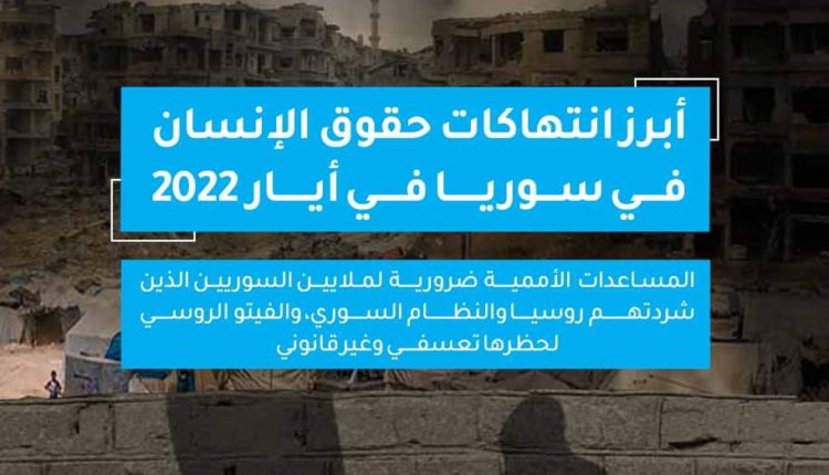 أصدرت الشبكة السورية لحقوق الإنسان يوم الثلاثاء 7 حزيران 2022 تقريرها الشهري الخاص الذي يرصد حالة حقوق الإنسان في سوريا في شهر أيار 2022، وأشارت فيه إلى أنَّ المساعدات الأممية ضرورية لملايين السوريين الذين شردتهم روسيا والنظام السوري، والفيتو الروسي لحظرها التعسفي وغير القانوني.