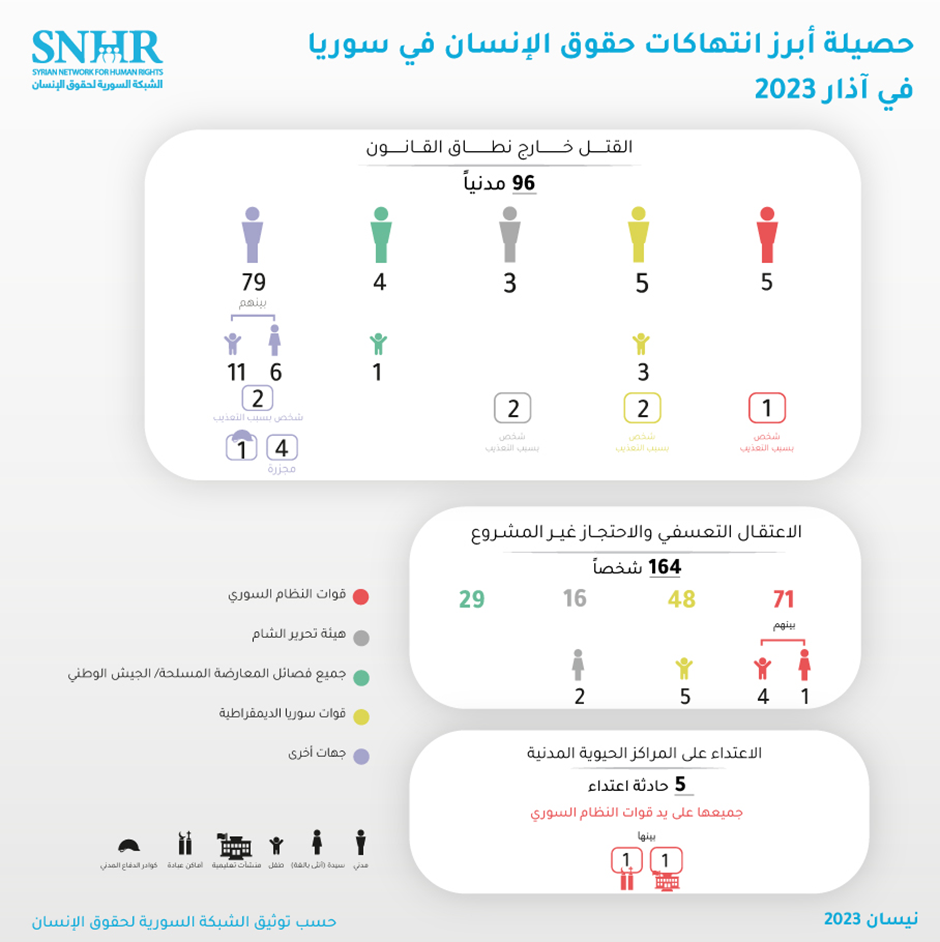 الشبكة السورية توثق أبرز انتهاكات حقوق الإنسان في سوريا في آذار 2023