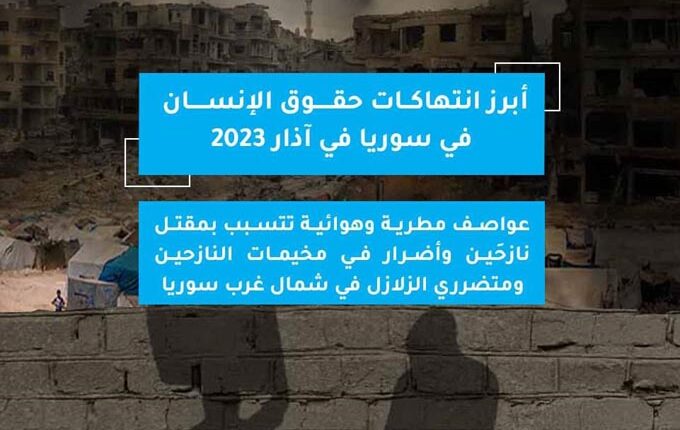 أصدرت “الشبكة السورية لحقوق الإنسان” يوم الخميس 6 نيسان 2023، تقريرها الشهري الخاص الذي يرصد حالة حقوق الإنسان في سوريا، واستعرضت فيه حصيلة أبرز انتهاكات حقوق الإنسان على يد أطراف النزاع والقوى المسيطرة في سوريا في آذار 2023، وقالت فيه “إن عواصف مطرية وهوائية تسببت بمقتل نازحين وأضرار في مخيمات النازحين ومتضرري الزلزال في شمال غرب سوريا”.