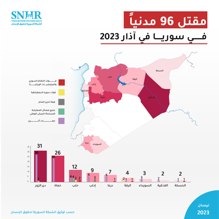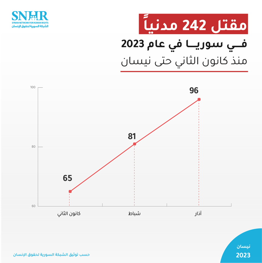 سجَّل التقرير في شهر آذار مقتل 96 مدنياً بينهم 15 طفلاً وست سيدات، لتصبح حصيلة الضحايا على يد أطراف النزاع والقوى المسيطرة في سوريا 242 مدنياً منذ مطلع عام 2023 حتى نيسان من العام ذاته.