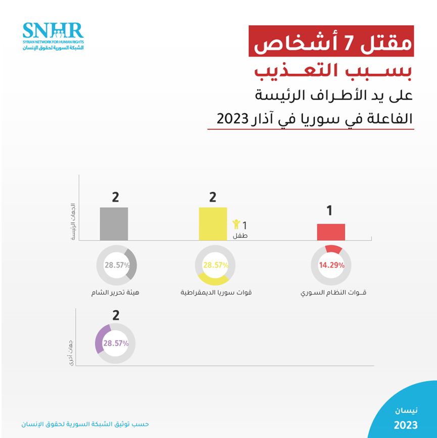 وثَّق التقرير في آذار مقتل سبعة أشخاص بسبب التعذيب على يد أطراف النزاع والقوى المسيطرة، وقد أصبحت حصيلة الضحايا بسبب التعذيب 15 شخصاً قتلوا منذ مطلع العام الجاري حتى نيسان من العام ذاته.