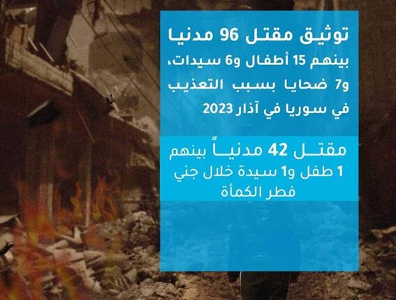 أصدرت “الشبكة السورية لحقوق الإنسان”، يوم السبت 1 آذار 2023، تقريرها الشهري الخاص بحالات القتل خارج نطاق القانون في سوريا خلال شهر آذار المنصرم، حيث وثقت فيه مقتل 96 مدنياً بينهم 15 طفلاً وست سيدات، وسبع ضحايا بسبب التعذيب. وأشارت إلى مقتل 42 مدنياً بينهم طفل واحد وسيدة واحدة خلال جني فطر الكمأة.
